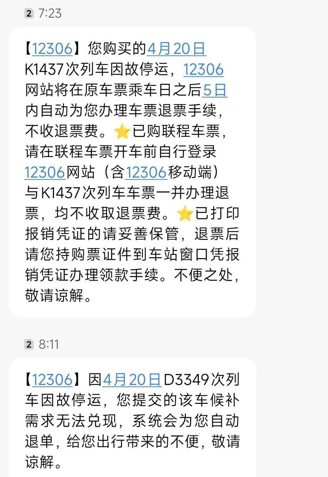 另有河南周口的网友林芬(化名)告诉极目新闻记者,她原计划20日上午从周口出发去杭州。早晨7时许收到退票信息,原因是“因故停运”。“原本准备后面坐高铁,没想到候补了20分钟,还是自动给我退票了。”林芬称,等她再刷新列表后,发现20日当天所有的车次都没有了。林芬称,19日周口本来是阴天,到晚上9点左右,突然开始刮大风,下大雨,她怀疑列车停运可能跟天气有关。